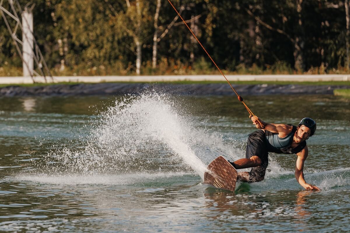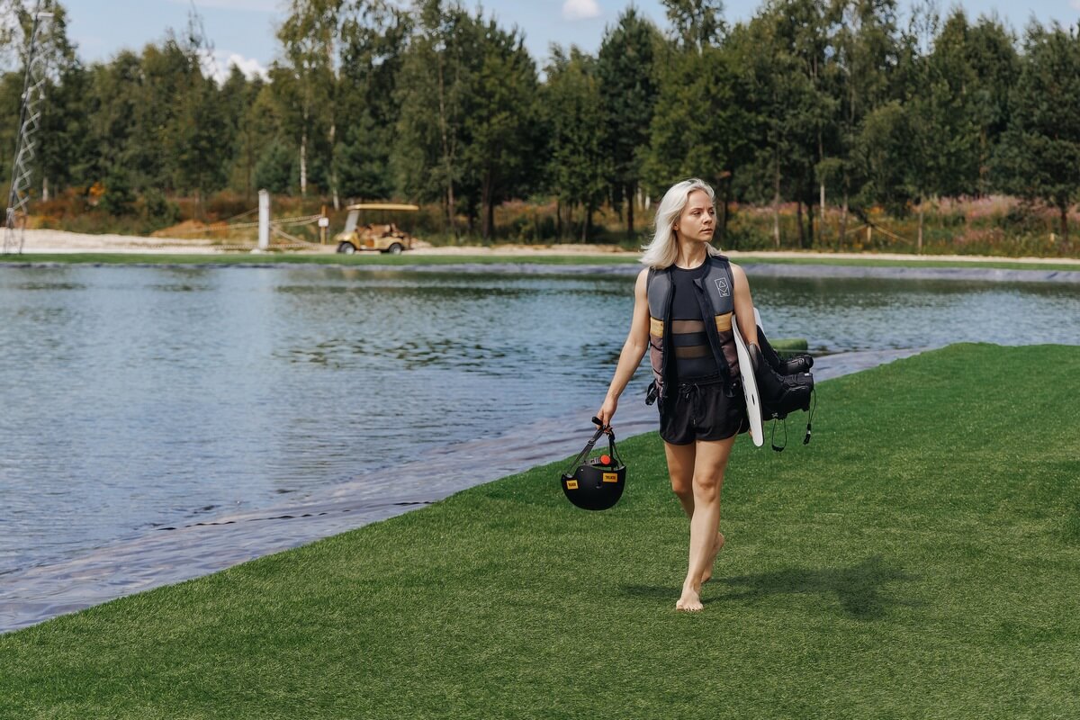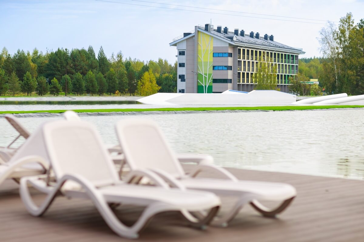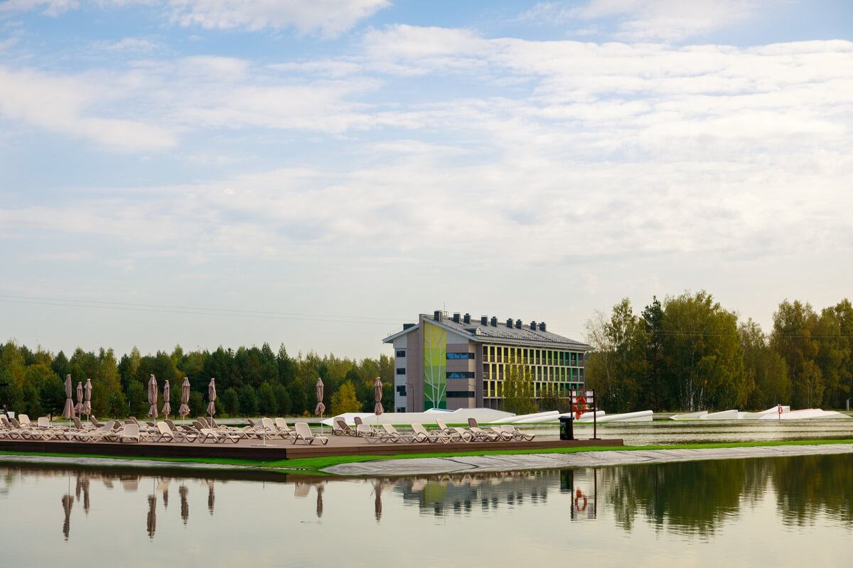 Летом - вейк-парк, пляжная зона с лежаками и батуты, зимой - катание на банане и открытый каток.