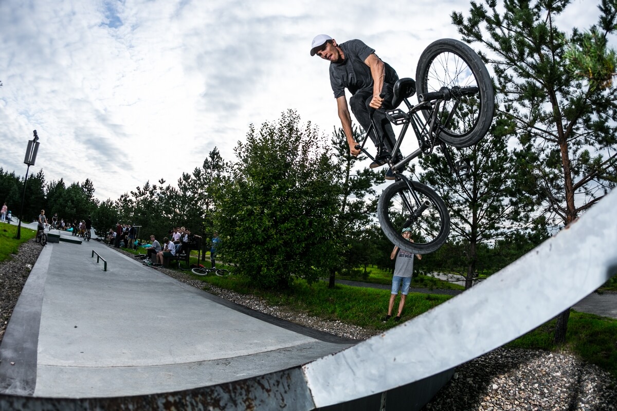 Открытая зона для катания на скейтборде, велосипеде или самокате в парке семейного отдыха.